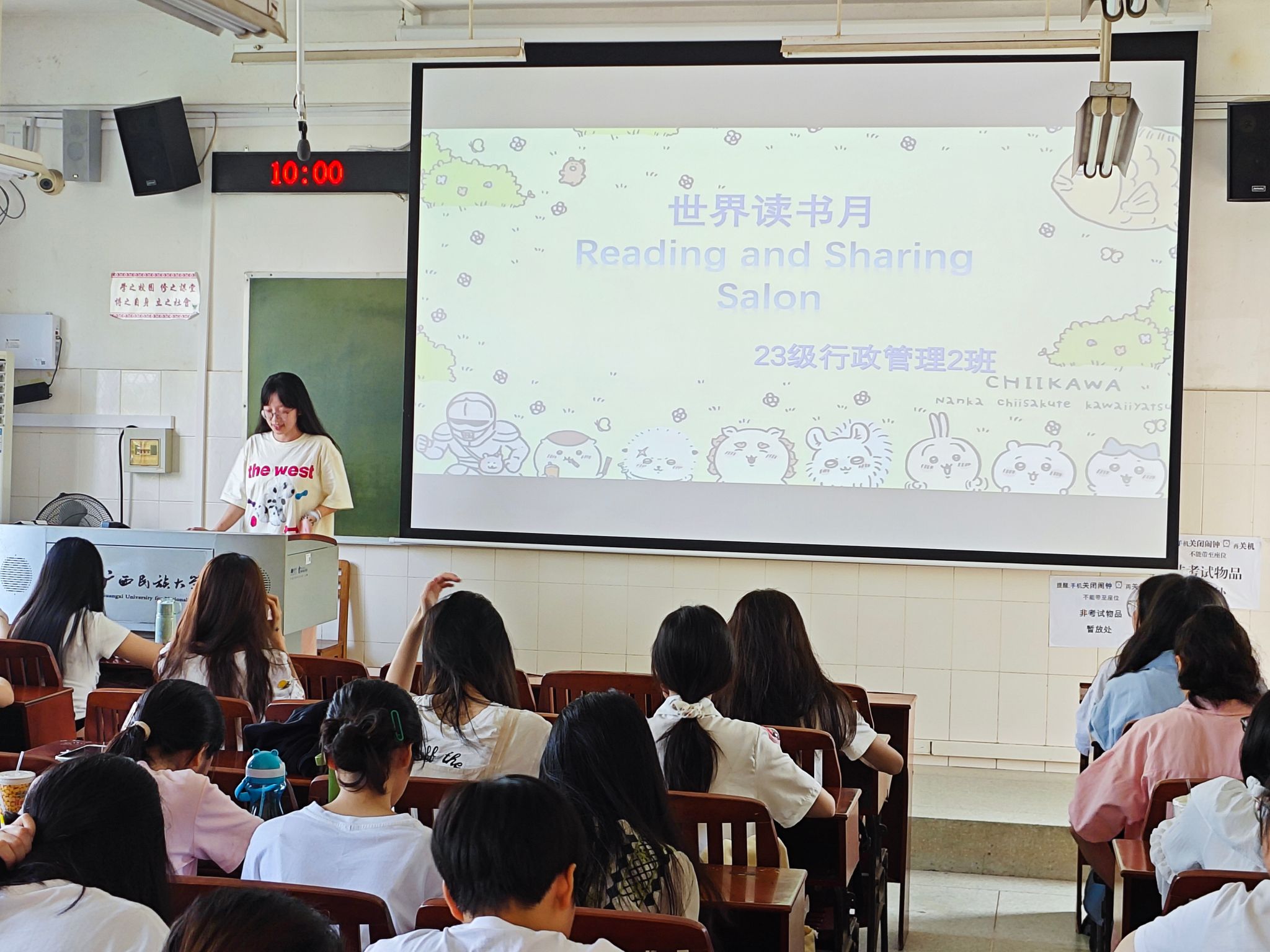 为积极宣传第 29 个“世界读书日”,丰富老员工的校园文化生活,激发老员工阅读兴趣,推动校园精神文明建设,2023级行政管理2班于4月19日在员工楼404教室开展了“世界读书月”主题班会活动。活动由团支书盘子芯主持,全班同学与会。